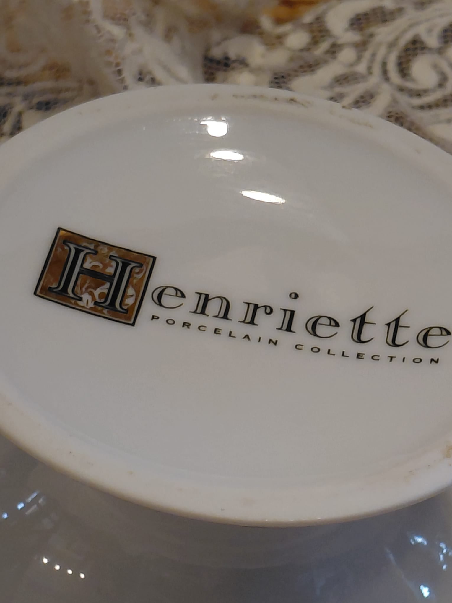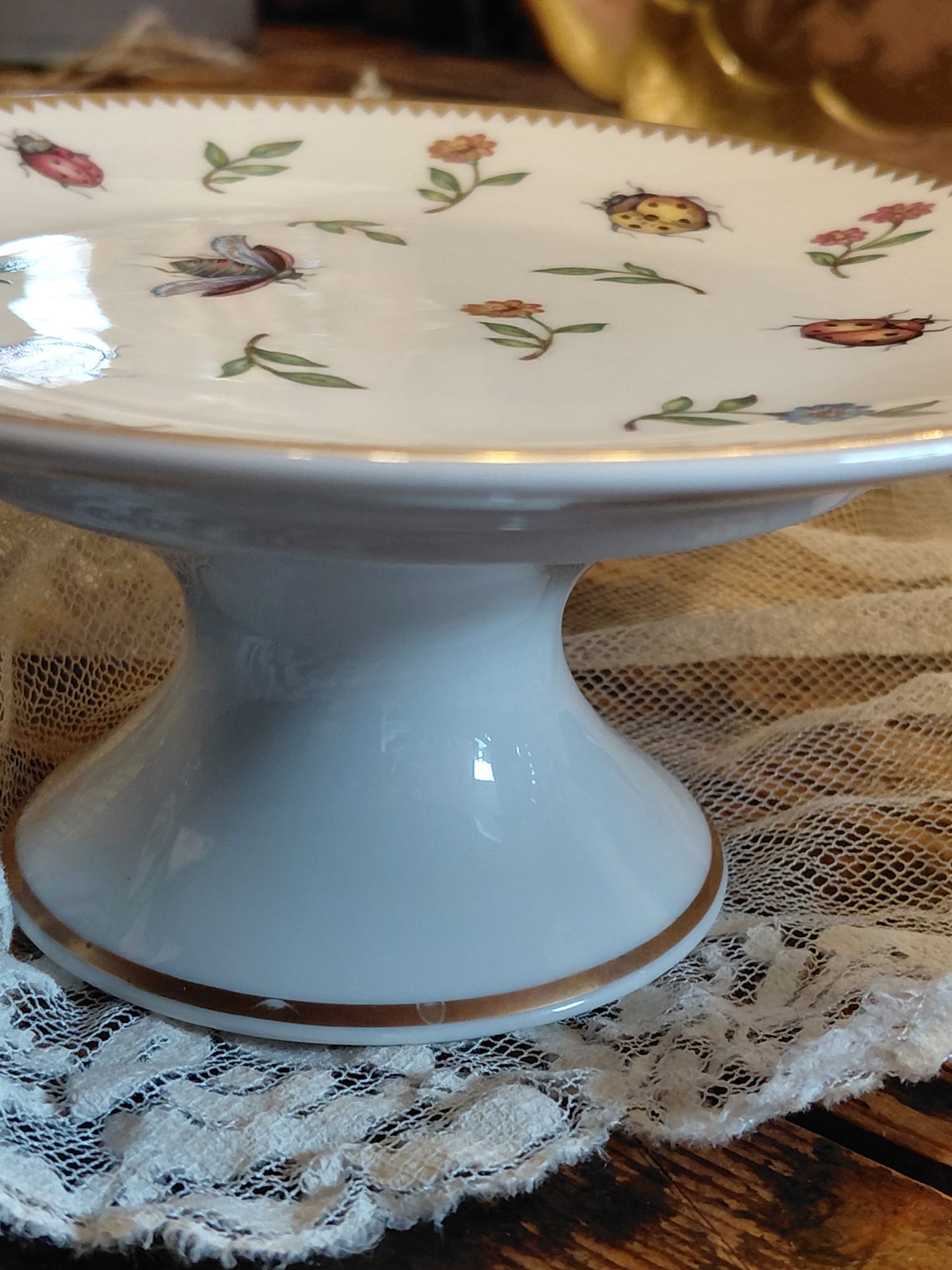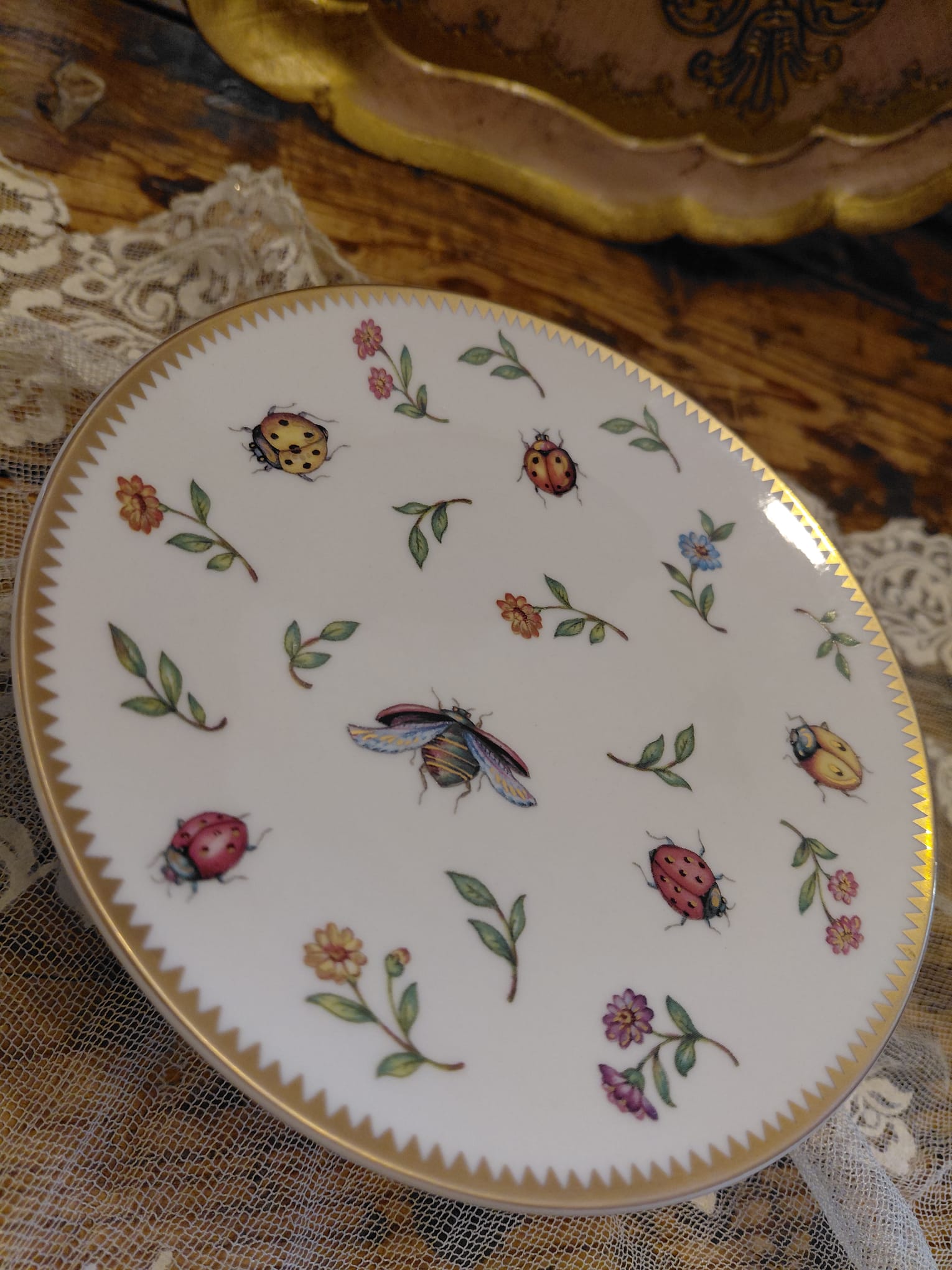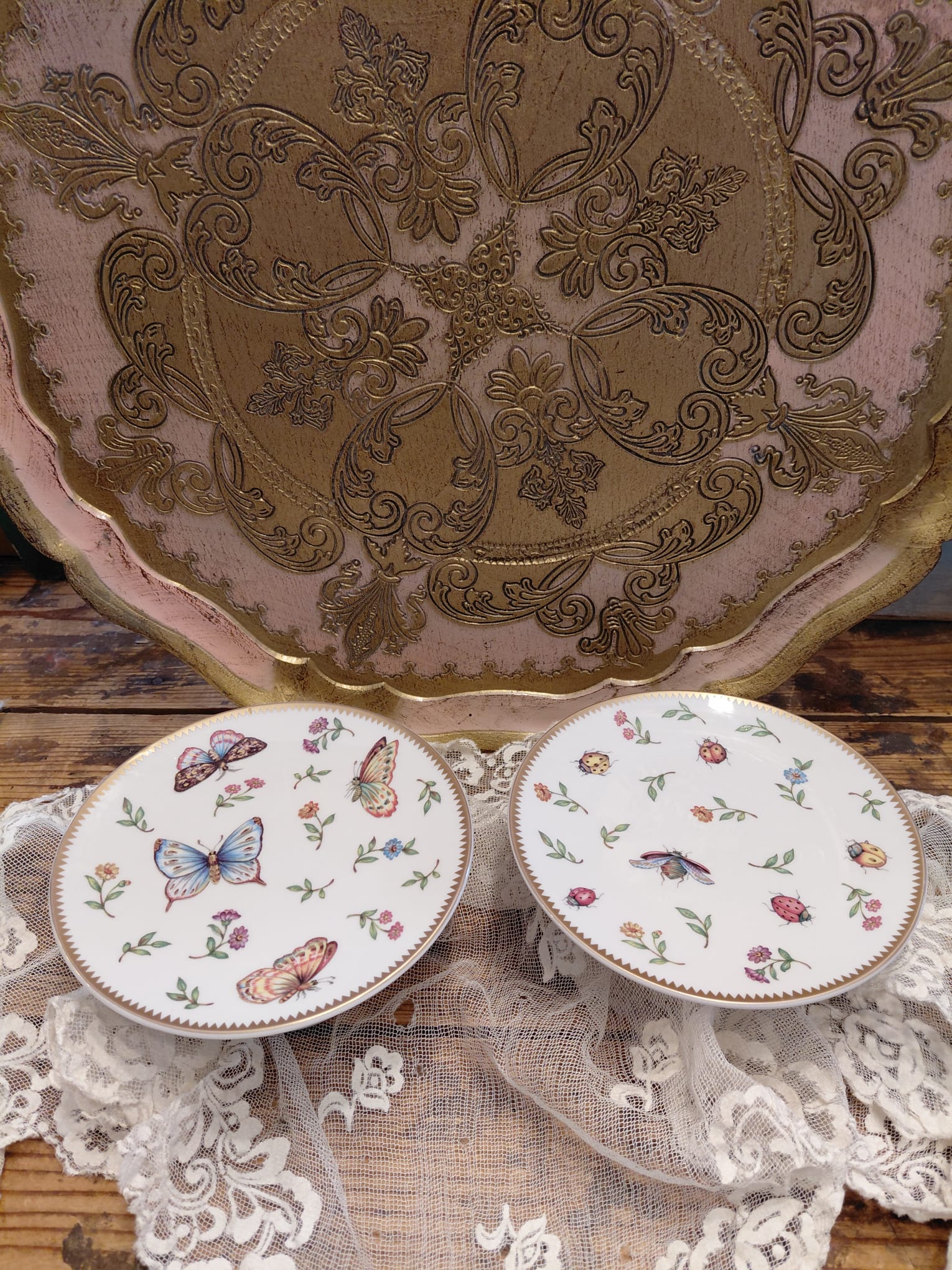 Piccole alzate in porcellana marchio Henriette con decoro floreale e bordo rifinito in oro una con farfalle e l'altra con coccinelle.