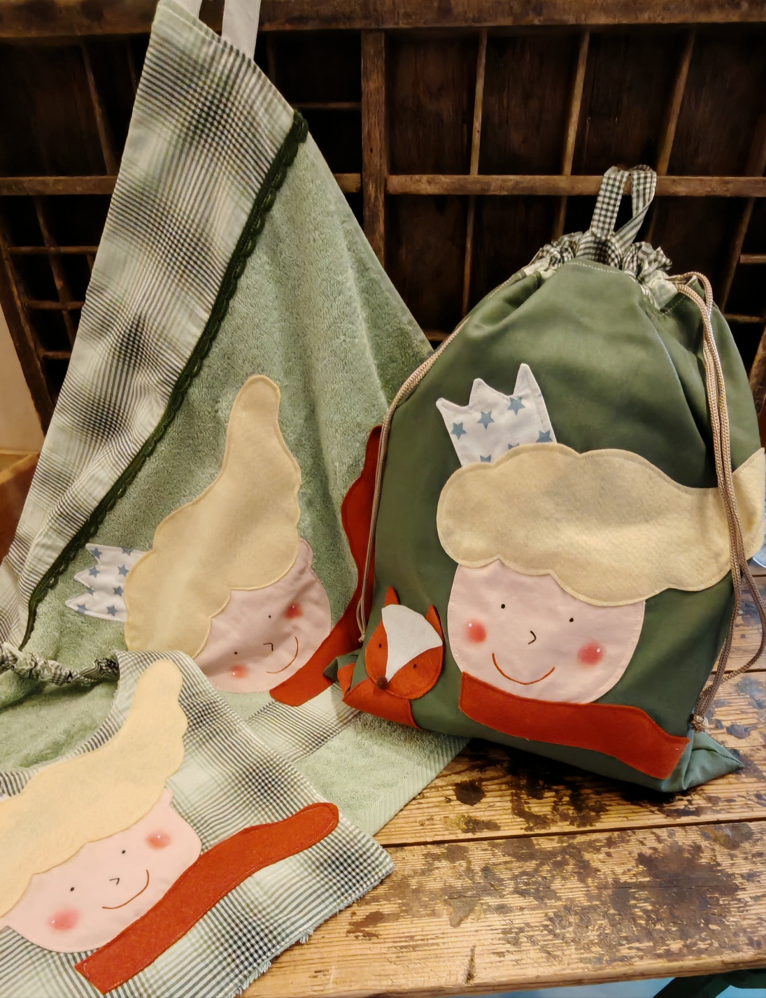 Disponibile anche il set completo di bavaglino, sacca e asciugamano da appendere.