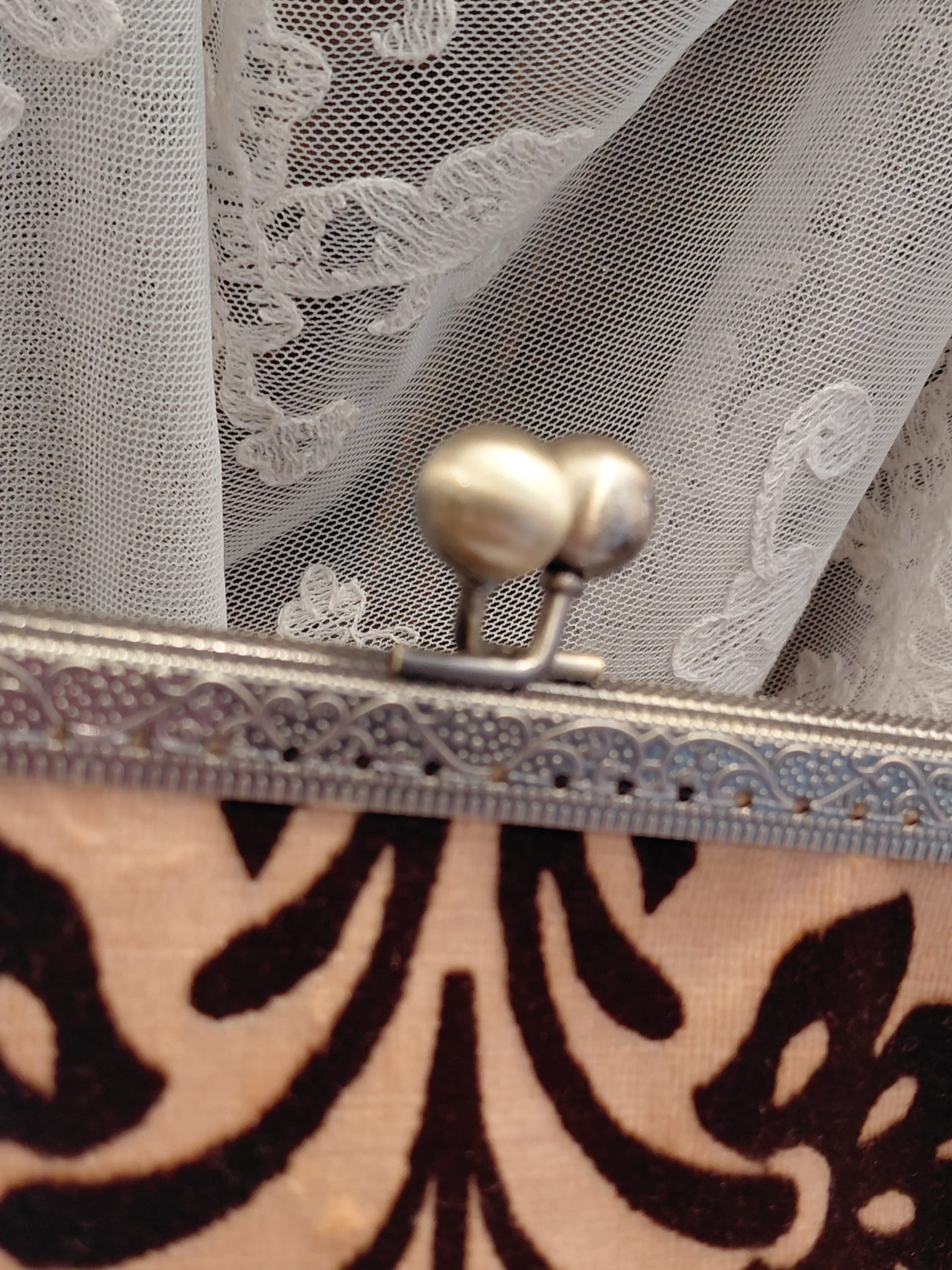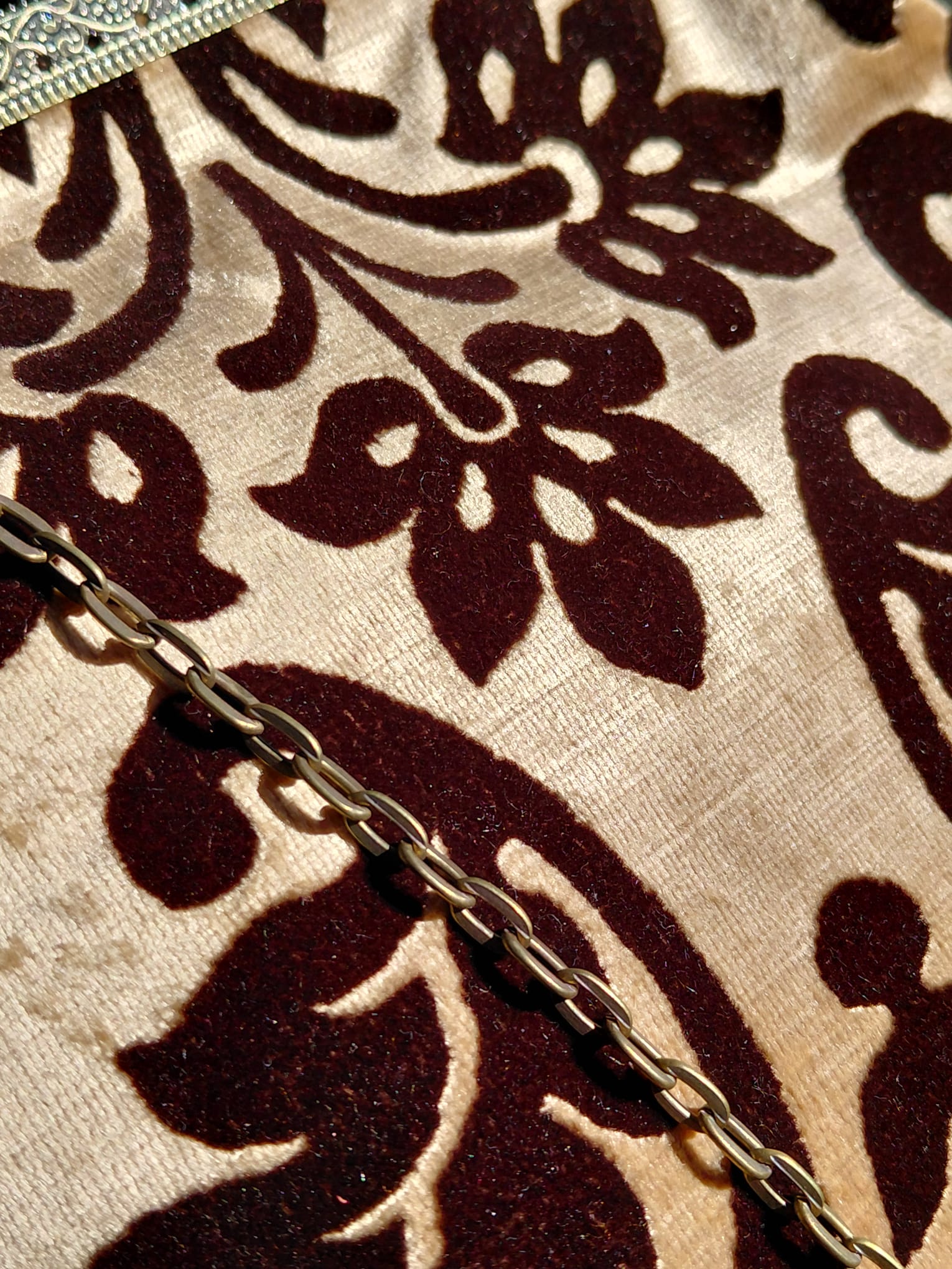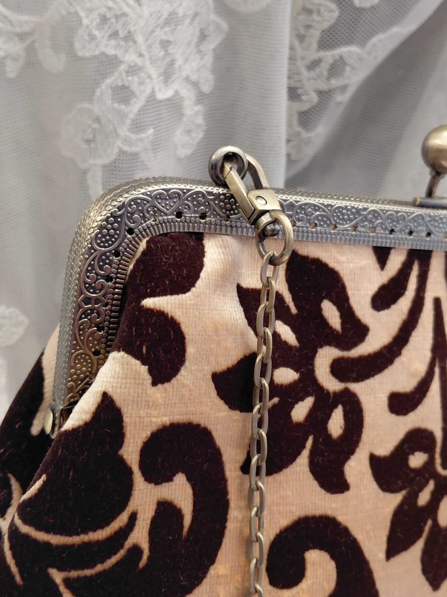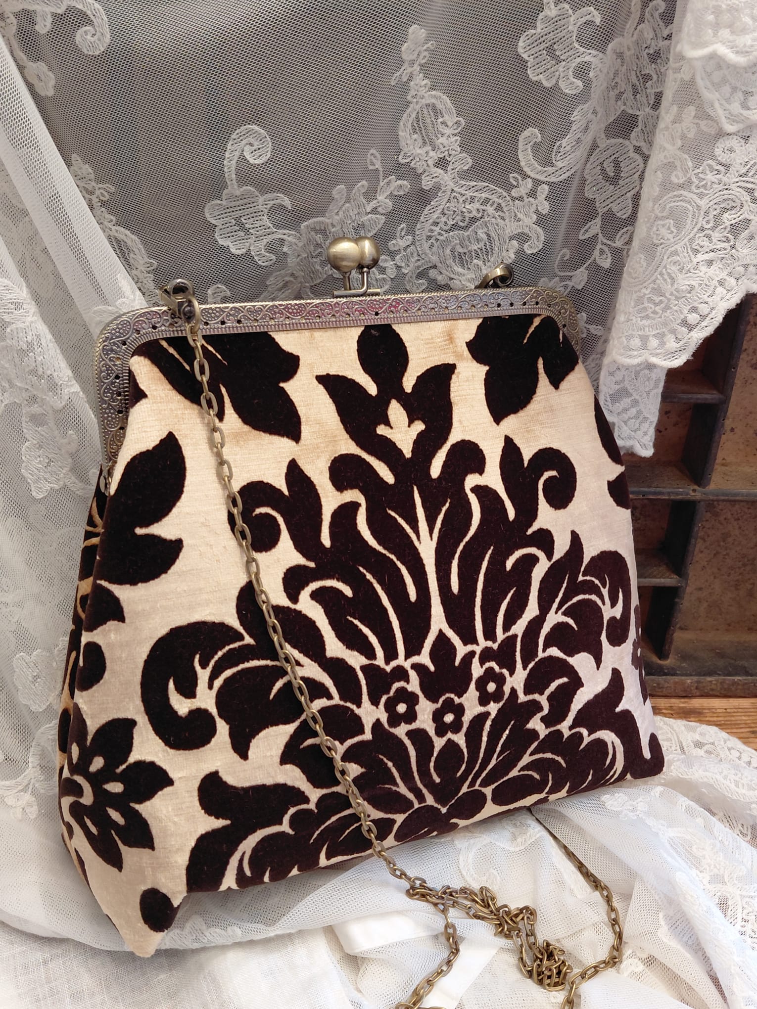 Borsa con chiusura clic/clac, catena a tracolla e portamonete in pendant cuciti a mano dalla nostra artigiana in prezioso velluto 3D.