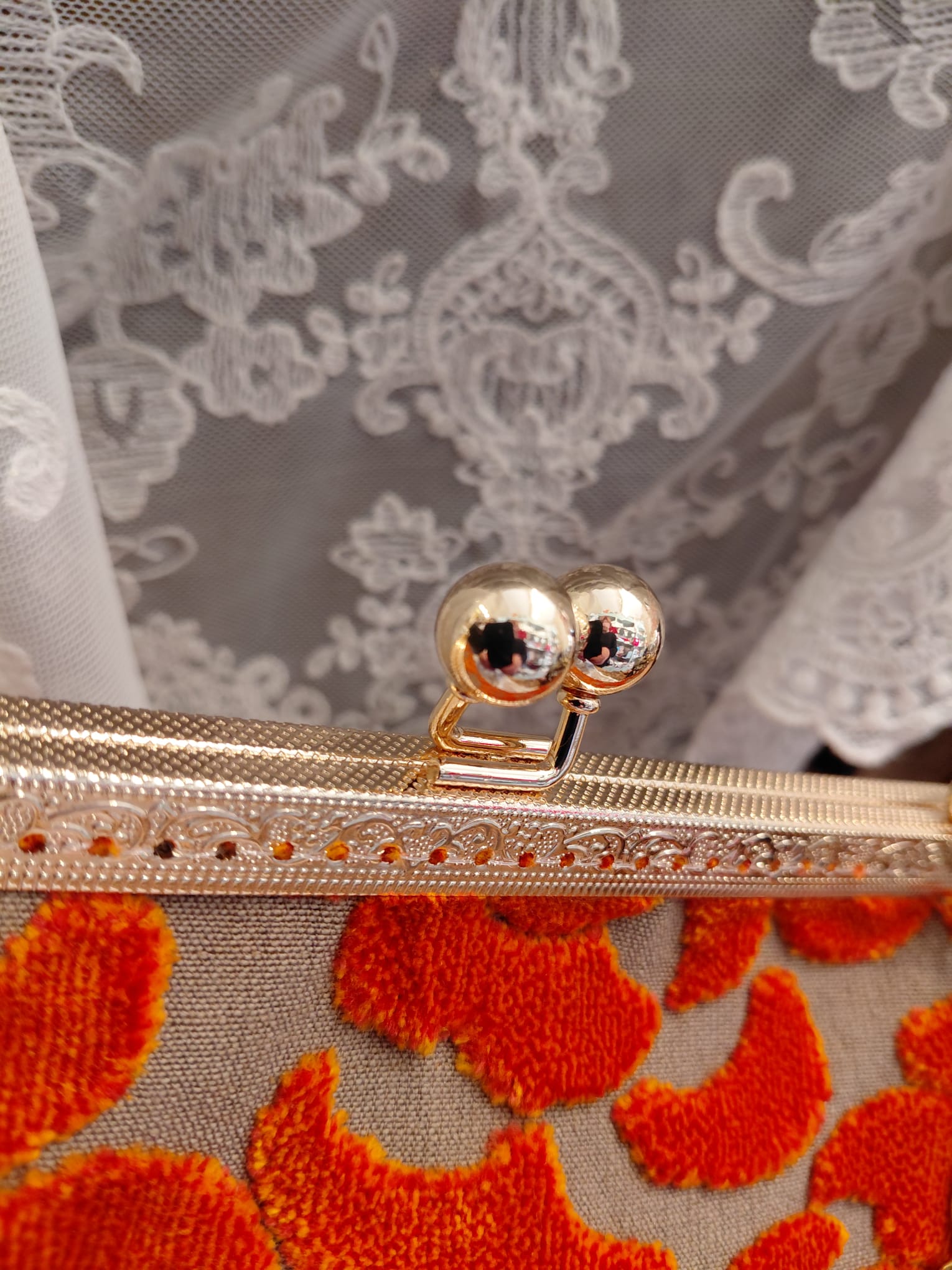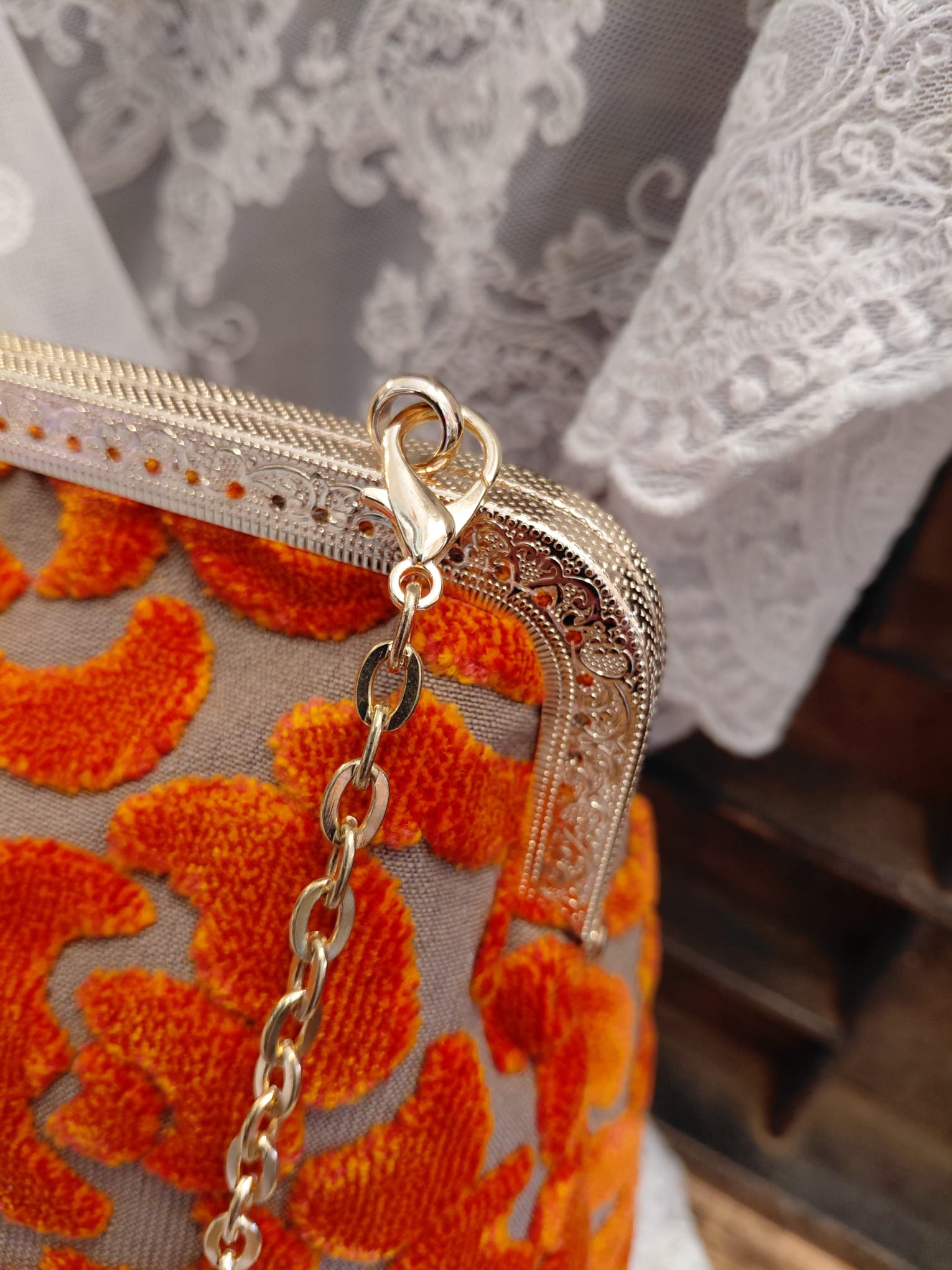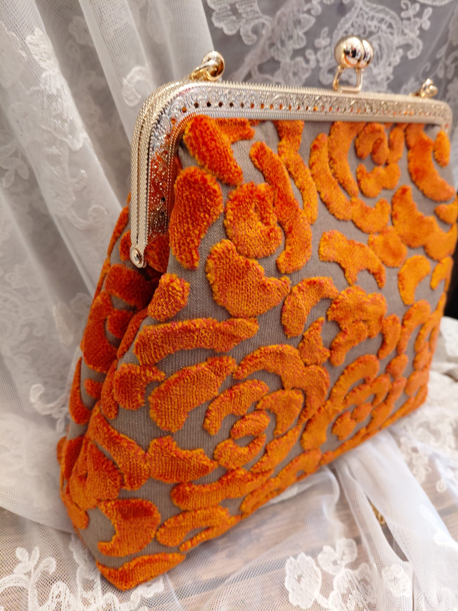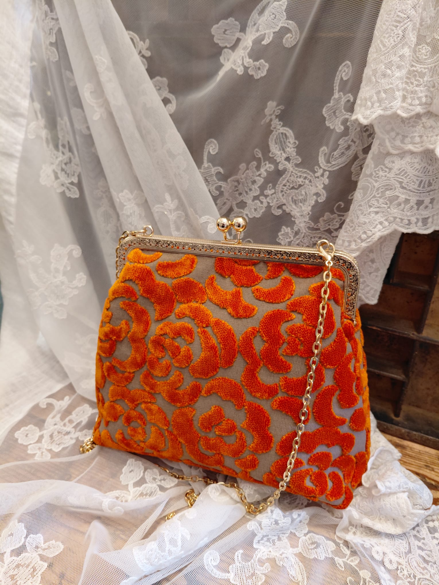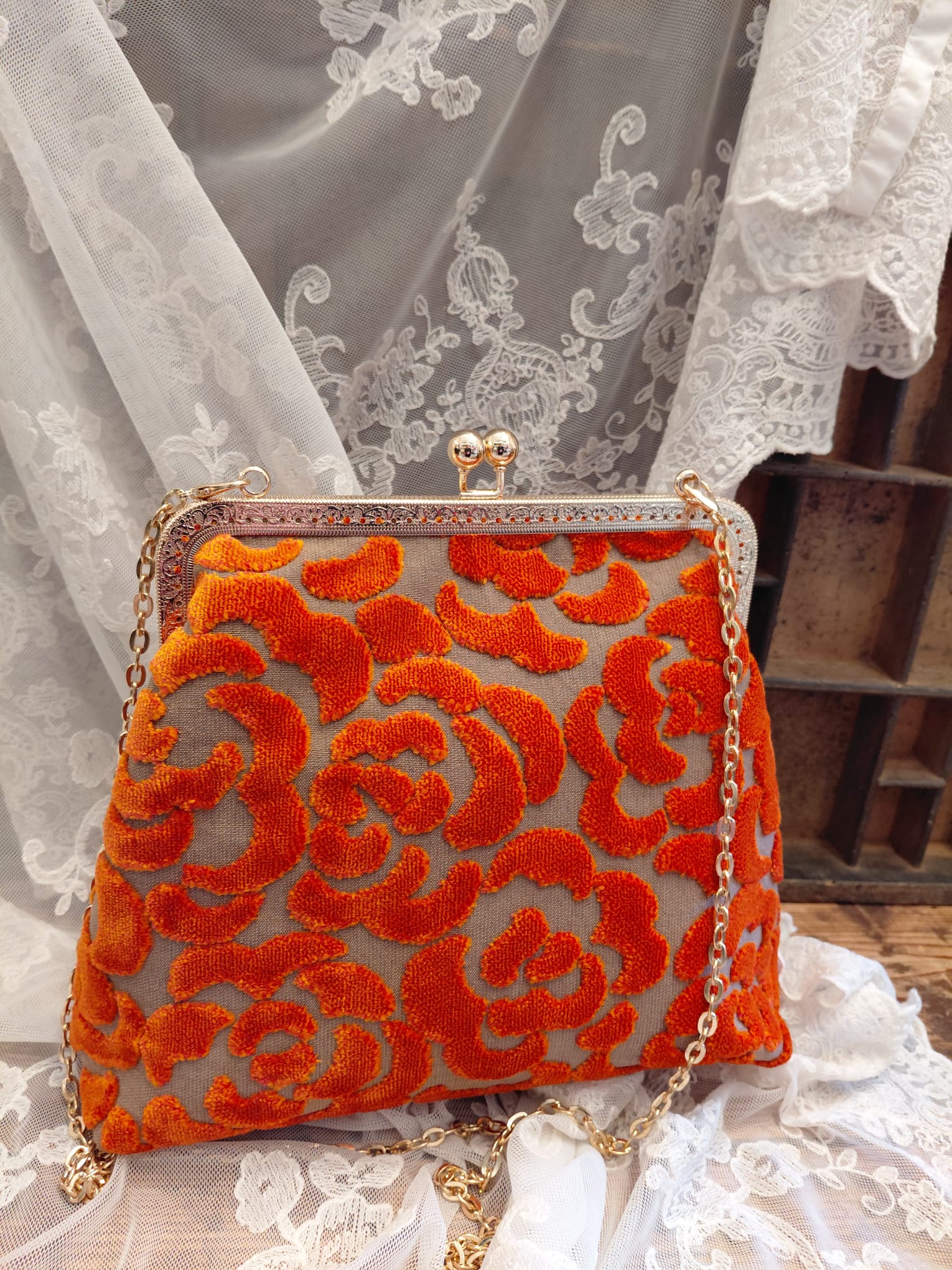 Borsa con chiusura clic/clac, catena a tracolla e portamonete in pendant cuciti a mano dalla nostra artigiana in prezioso velluto 3D.