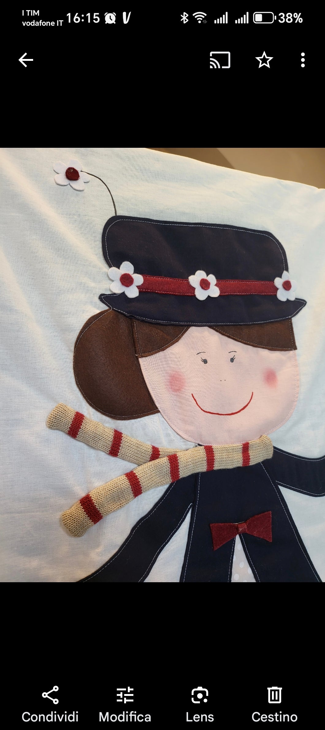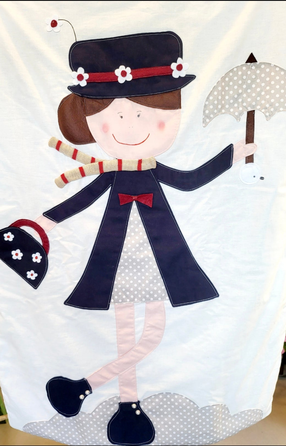 Piccola Coperta imbottita di Mary Poppins cucita e dipinta a mano dalla nostra artigiana in morbido tessuto di cotone e pannolenci, con imbottitura in ovatta in versione non sfoderabile. Realizzato per il lettino con le sbarre è possibile personalizzarlo con misure e soggetto a scelta.