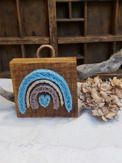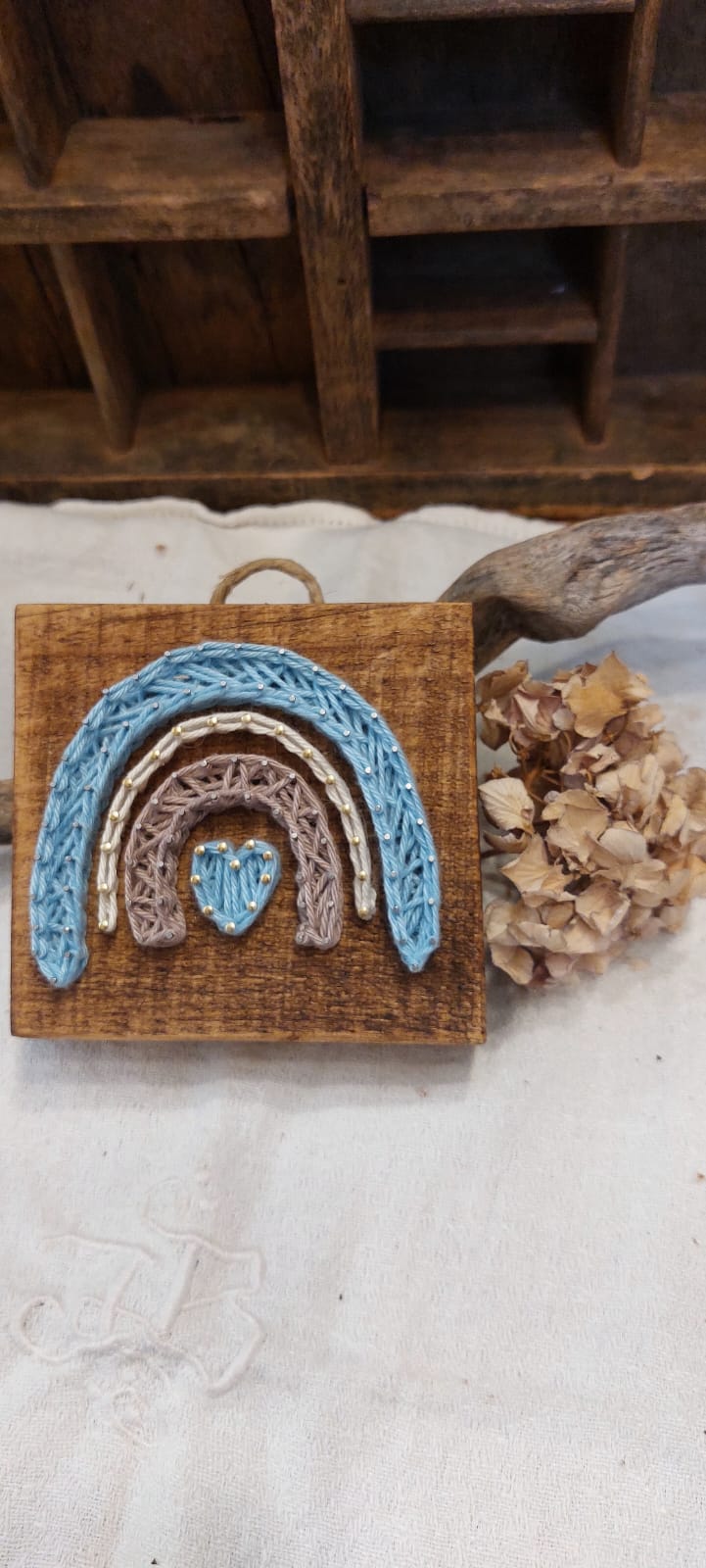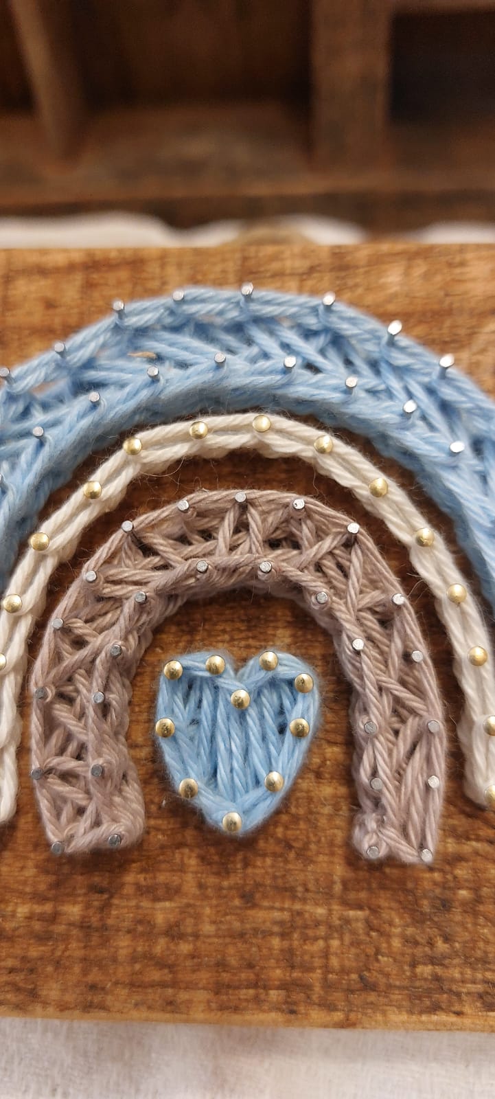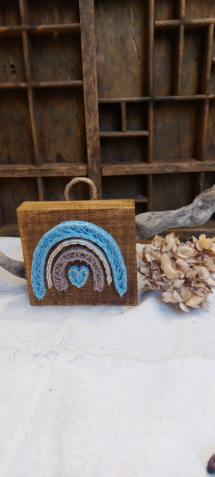 Legnetto Arcobaleno in legno di abete grezzo, leggermente smerigliato e rifinito con cera. La maggior parte dei lavori sono realizzati con filo 100% di cotone mercerizzato. I fili dorati sono invece di poliestere.