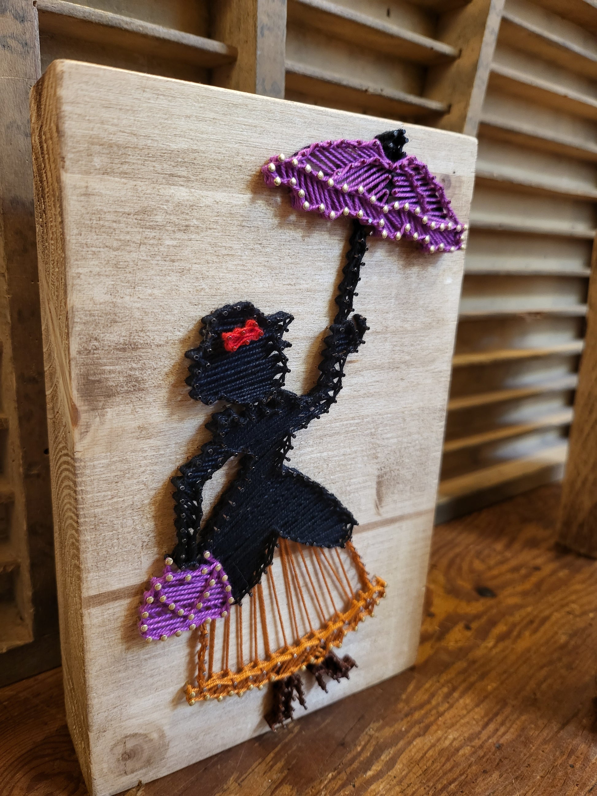 Legnetto Mary Poppins con ombrellino in legno di abete grezzo, leggermente smerigliato e rifinito con cera. La maggior parte dei lavori sono realizzati con filo 100% di cotone mercerizzato.