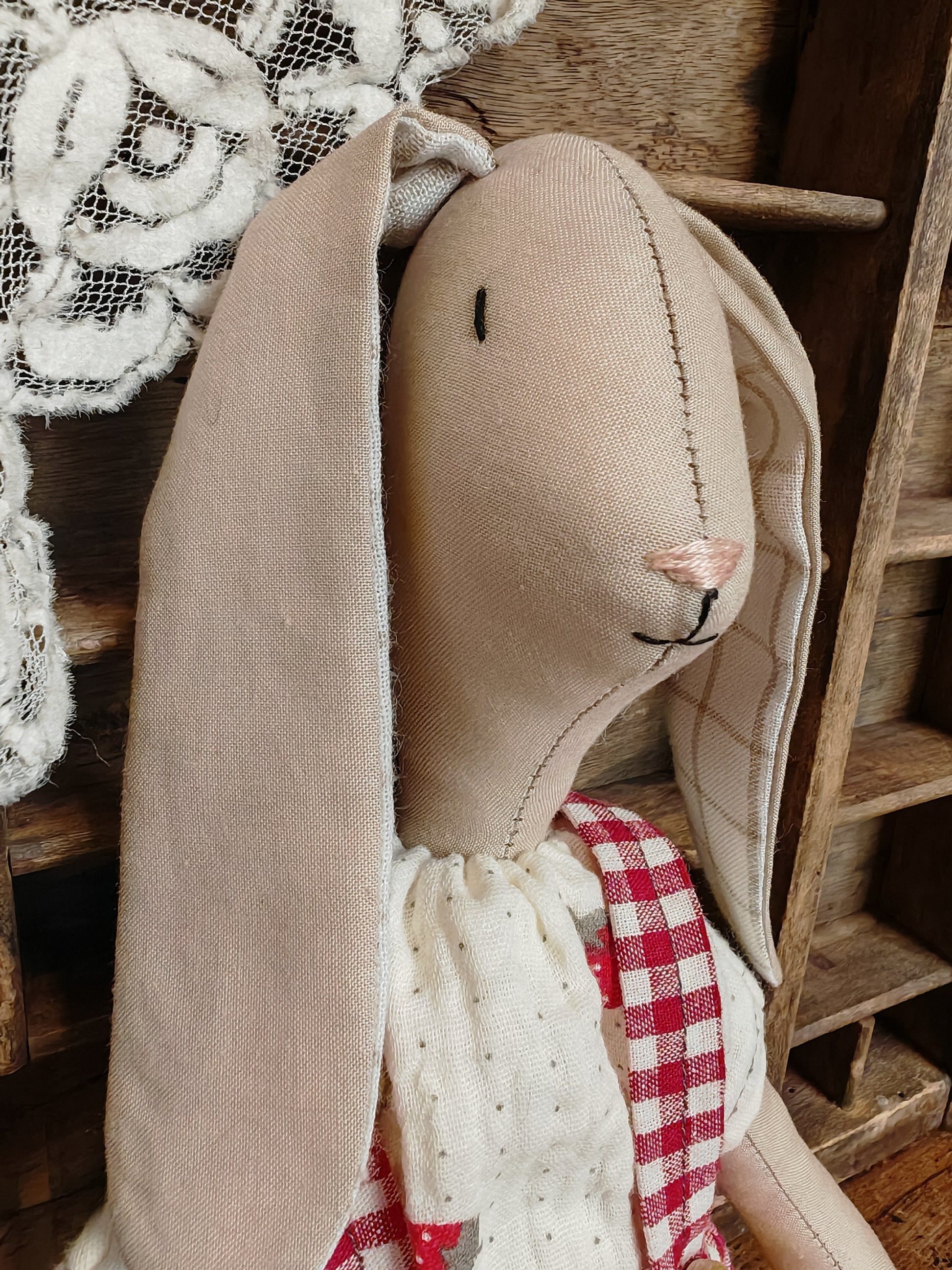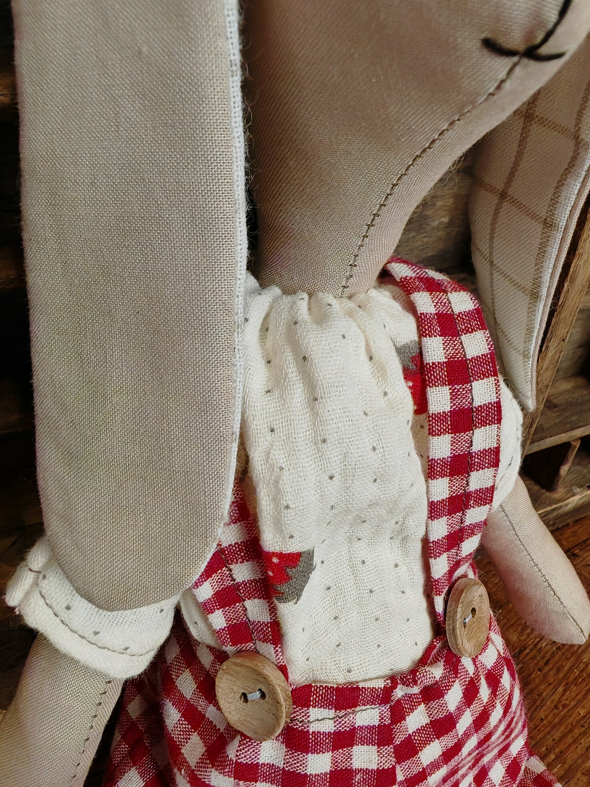 Pupazzo Coniglietta cucita, dipinta a mano dalla nostra artigiana e curata in ogni minimo dettaglio. Ogni oggetto è una creazione unica.