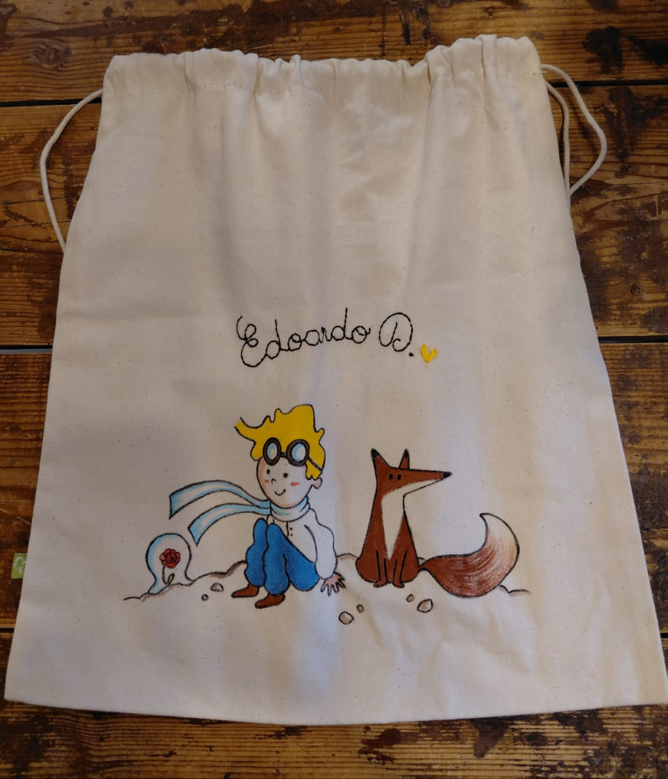 Sacca di grandi dimensioni in cotone dipinta a mano con soggetto Piccolo Principe.