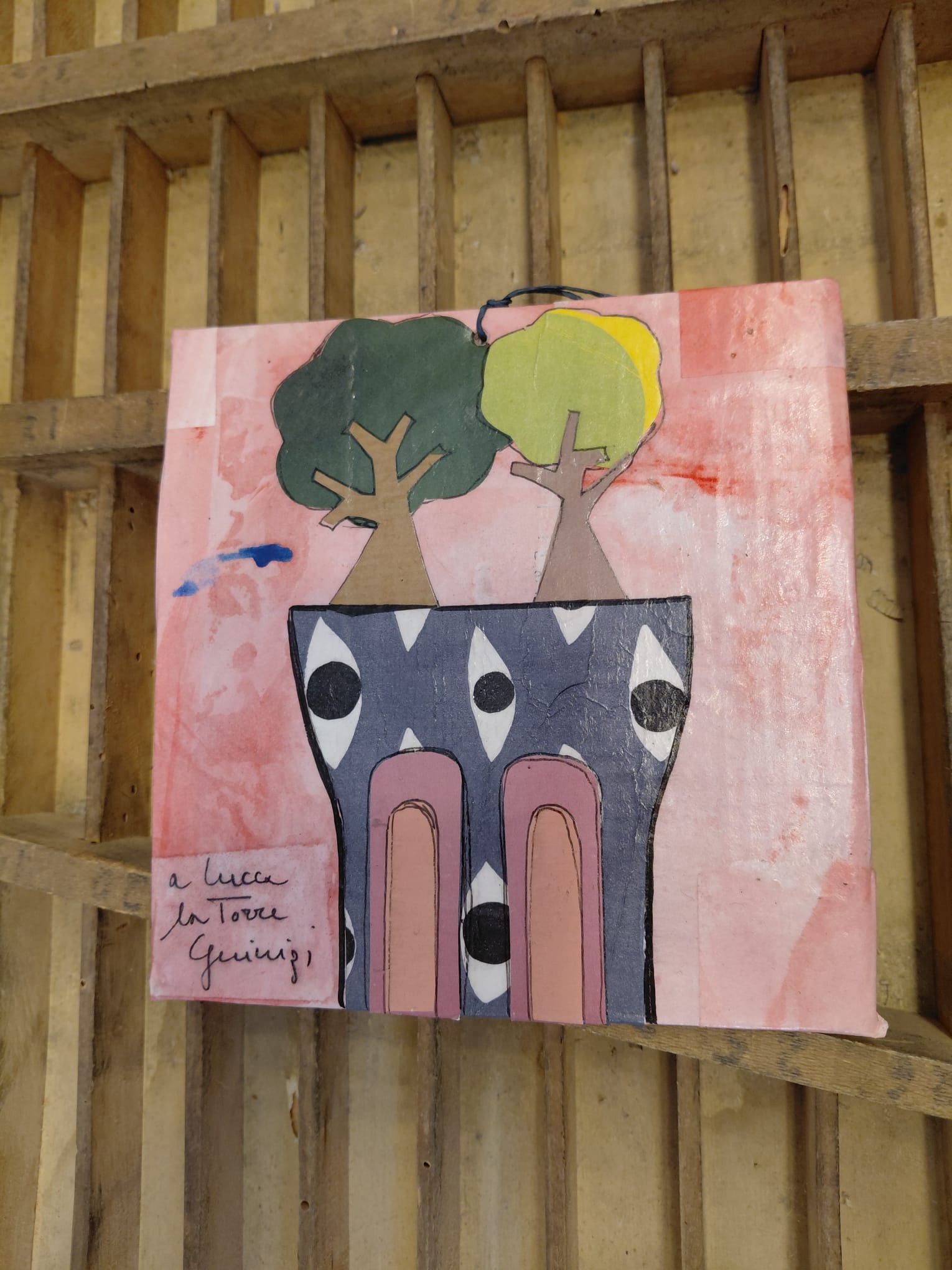 Quadretto in cartapesta da appendere raffigurante la famosa Torre Guinigi di Lucca, realizzato con collage e tecnica mista. Pezzi unici, fatti e dipinti a mano.